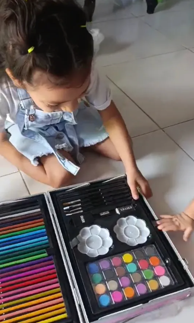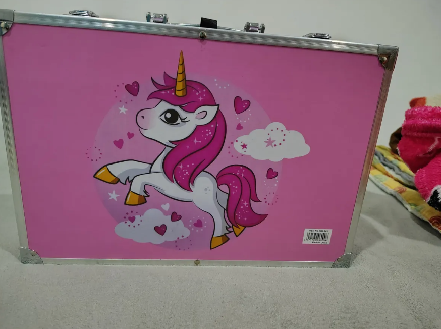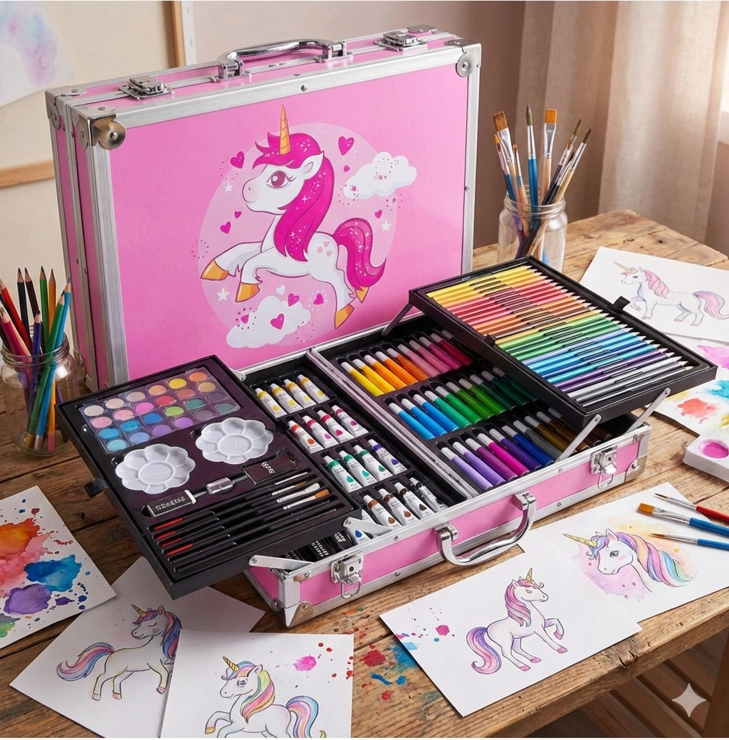 Con un elegante maletín metálico con diseño unicornio, este set reúne más de 150 herramientas artísticas organizadas y listas para usar.